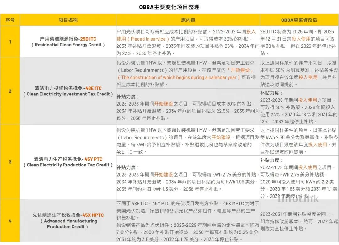 盡管OBBA草案尚待美國參議院審查,距離正式立法仍有不確定性,但其內容已足以對市場預期產生影響,本文將針對草案中與光伏相關之條文進行解析,并探討其可能對美國光伏市場所帶來的影響。